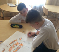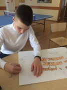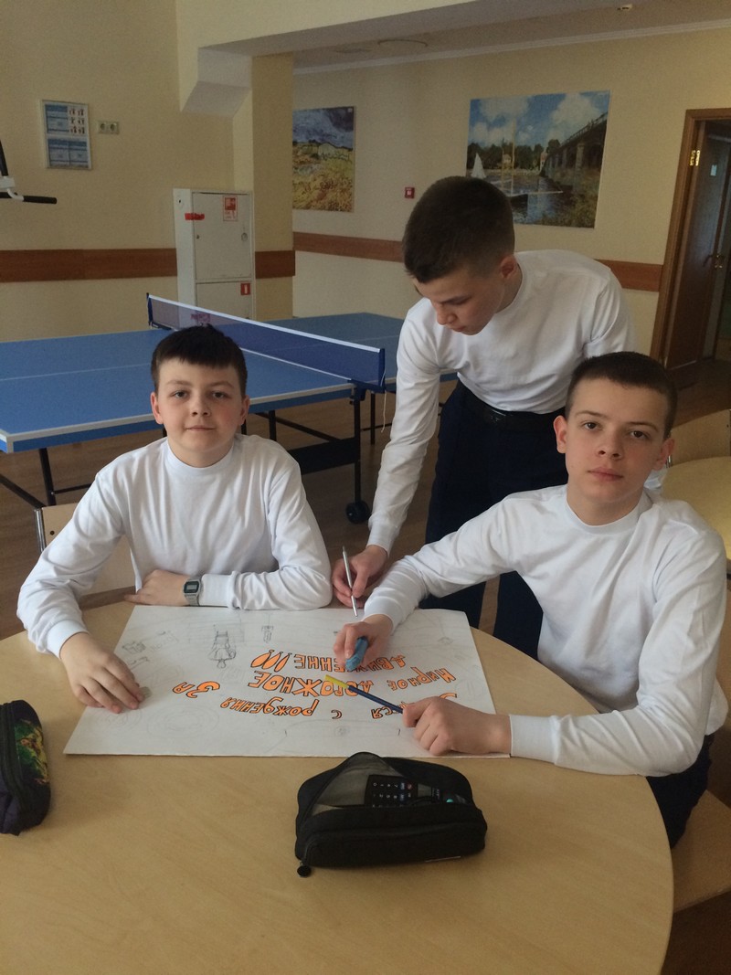 Вторая работа – плакат с лозунгом конкурса и глубоким поучительным смыслом. Над его созданием трудились кадеты 6 «Г» класса: Даниил Тимаревский, Матвей Дешпет и Родион Батищев. Ребята постарались визуально донести главную идею: дорожная безопасность зависит от каждого.