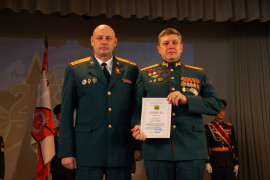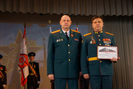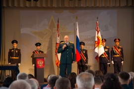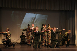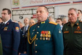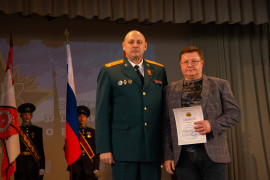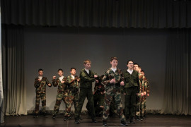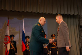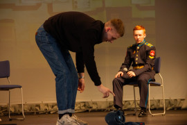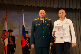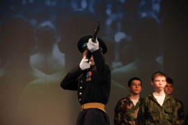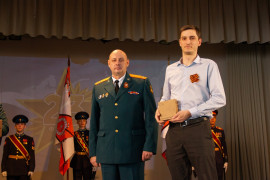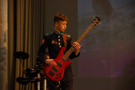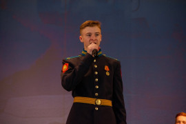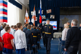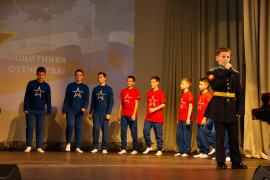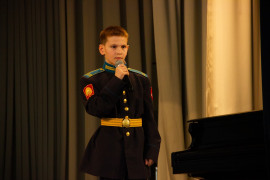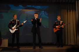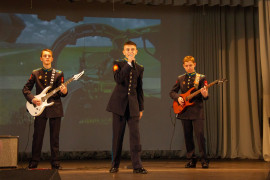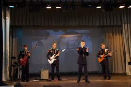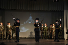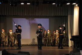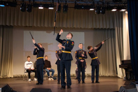 Кадеты 9 «А» класса подготовили необычное музыкально-театрализованное представление – сценку «В военкомате». По сюжету призывники, которые не хотели служить в армии, после разговора с военкомом, меняют свои жизненные ценности и интересы и понимают, кто такой настоящий мужчина и защитник. Сцена сопровождалась выступлением парадно-строевого расчета и вокальным выступлением кадета 9 «А» класса Андрея Марголина.