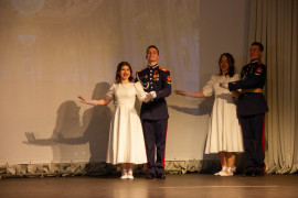 Затем кадеты АДЕККК, легко и изящно скользя по сцене с прекрасными девушками, исполнили кадетский вальс.