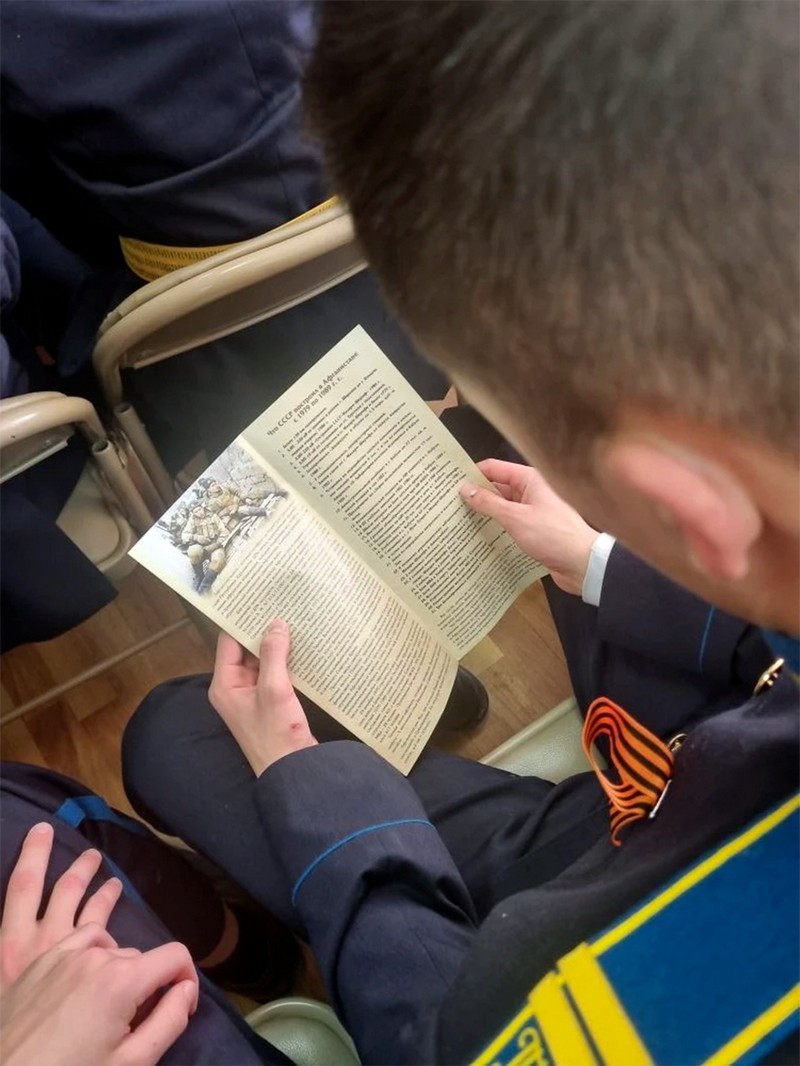 На встречу с кадетами пришёл подполковник запаса, участник событий 1979-1989 гг. Юрий Владимирович Митрясов, в настоящее время председатель Совета ветеранов Ленинского района г. Ставрополя. Слушая воспоминания воина-«афганца», награждённого орденом Красной Звезды за военную операцию в Афганистане, кадеты прочувствовали всю тяжесть солдатских будней на войне. Эмоциональный накал вызвал пронзительный отрывок из повести С.Алексиевич «Цинковые мальчики», а также волнующие кадры из фильма Ф. Бондарчука «9 рота» по одноимённой повести Ю. Короткова.