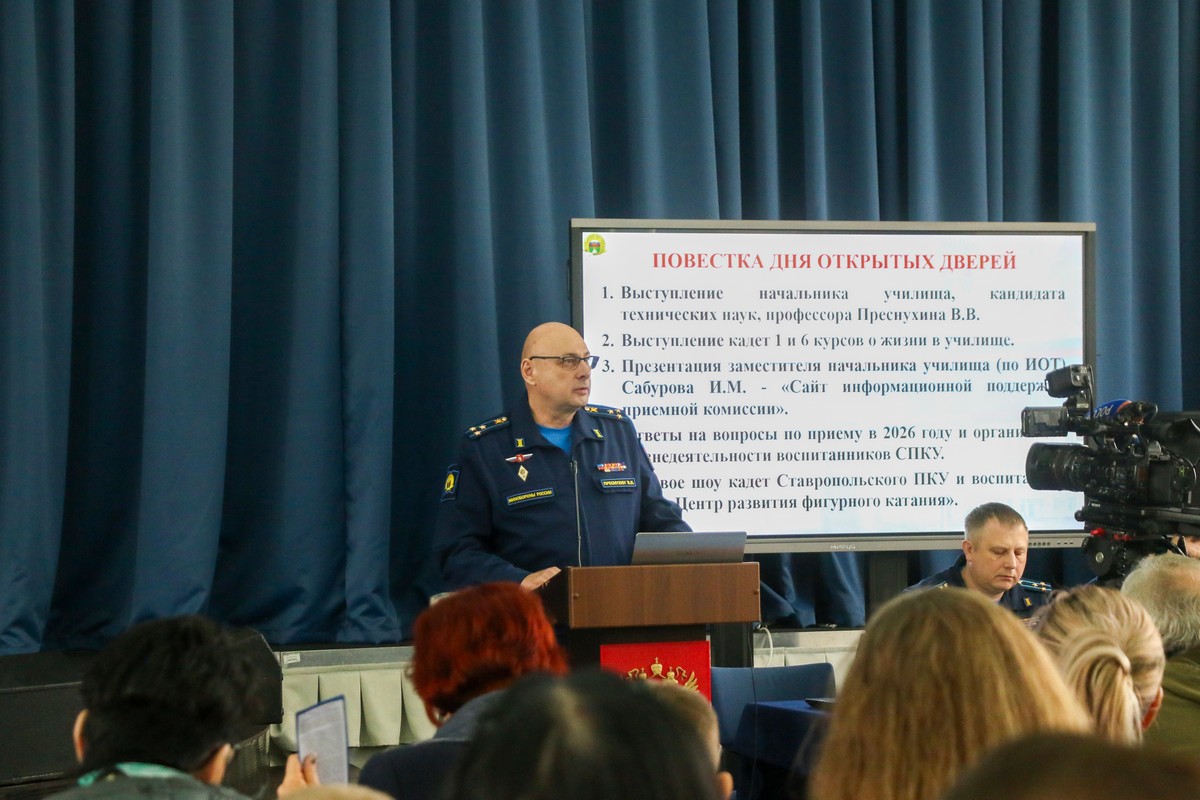 Во время встречи руководство училища рассказало присутствующим о правилах приёма и жизни воспитанников. Открыл встречу начальник Ставропольского ПКУ, кандидат технических наук, профессор Вячеслав Валерьевич Преснухин.