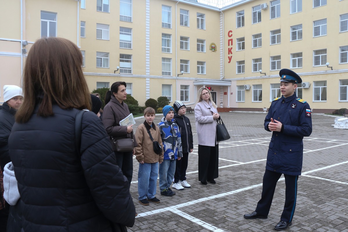 Знакомство гостей с училищем началось с экскурсии по территории СПКУ. Экскурсию проводили не педагоги, а сами воспитанники, которые показали, где располагаются спальные корпуса, столовая, ледовый каток, бассейн, стадион, учебный корпус, а также рассказали о своей жизни и учёбе. Поэтому абитуриенты могли из первых уст узнать о том, что их ждёт, когда они станут кадетами.