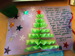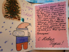 Воспитанники написали новогодние поздравления с добрыми словами и тёплыми пожеланиями в поддержку российских военнослужащих, выполняющих боевые задачи. Нарисовали тематические рисунки и сделали поделки, применяя технику оригами, аппликации и прочее. Работая над такой новогодней открыткой, кадеты прониклись чувством патриотизма и гордости за героичность и смелость тех, кто надёжно охраняет мирное небо над головой!