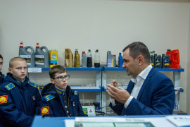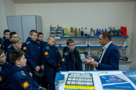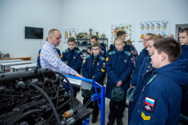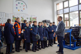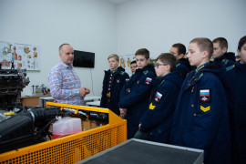 «Сегодня 7А класс идёт на экскурсию в Ставропольский государственный аграрный университет. На входе нас встречает кандидат технических наук, доцент кафедры электротехники, физики о охраны труда Михаил Анатольевич Афанасьев. Он провождает нас в Центр молодёжного инновационного творчества. Центр состоит из нескольких лабораторий и по этим лабораториям нам проводит экскурсию доцент Николай Александрович Марьин. В первой аудитории показывают в разрезе двигатели внутреннего сгорания Минского тракторного завода, которые являются аналогами танковых двигателей. В следующей показывают двигатель, а также трансмиссию трактора в наглядном виде и как они взаимодействуют друг с другом. В секторе сварки рассказывают, что здесь обучают студентов навыками сварки. Дальше нас ведут в учебно-научную лабораторию «Топливо-смазочные материалы и системы питания автотракторных двигателей», где мы встречаем студента, которого зовут Денис Алексеевич. Он рассказал, что здесь проводится анализ бензина и масла трактора и как отличают некачественный бензин от качественного. Один кадет спросил экскурсовода: