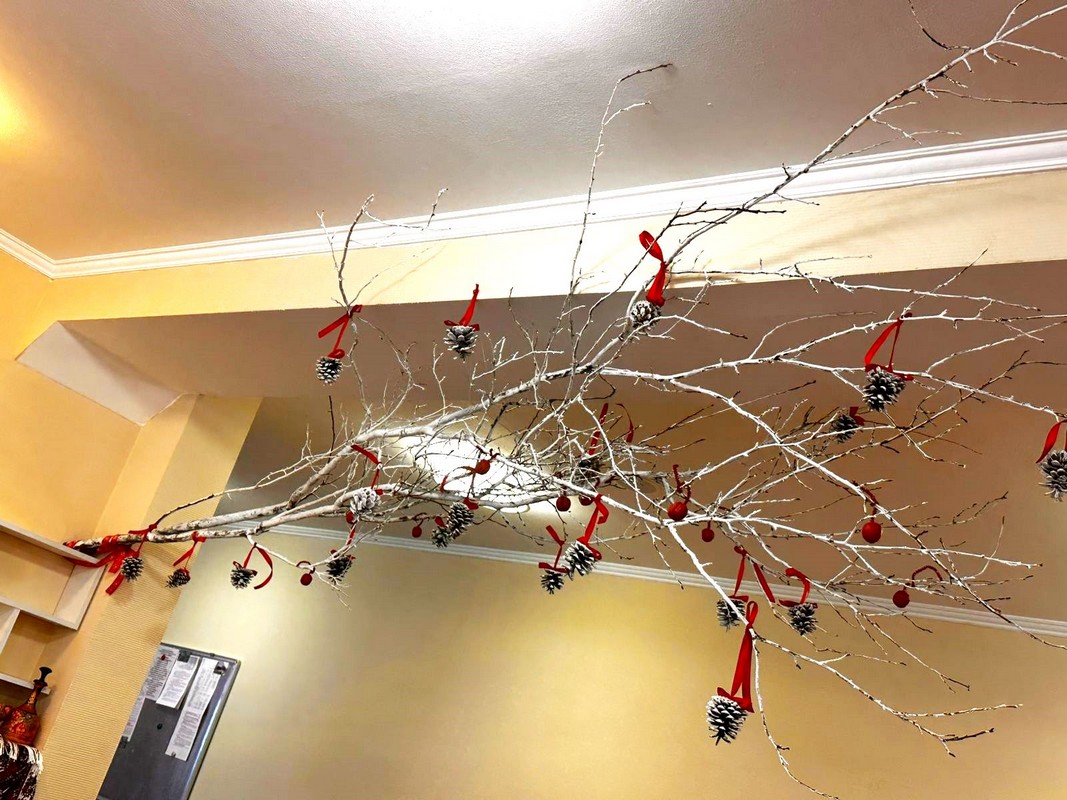 Особого внимания заслуживает потолочное украшение, выполненное в ярмарочном, праздничном стиле. Оно символично объединяет все зоны воедино, напоминая, что прошлое и настоящее неразрывно связаны, а Новый год - это праздник, который собирает вместе поколения.