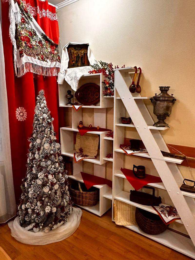 Комната разделена на условные зоны, каждая из которых рассказывает свою историю. В одной части комнаты воссоздана атмосфера старинной русской избы. Подлинные предметы быта наших предков - от утвари до элементов декора - позволяют кадетам буквально прикоснуться к истории и почувствовать, как встречали зимние праздники их прадеды. Настоящим символом традиционного Нового года здесь стала полутораметровая ель, сделанная исключительно из природных материалов.