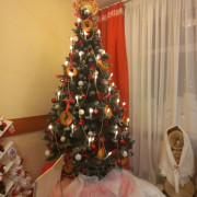 Другая часть комнаты посвящена современному прочтению народной эстетики. Здесь царит дух веселья и креатива - нарядная ёлка с бубликами и кокошник, венчающий её макушку, вызывают улыбку и создают по-настоящему праздничное настроение.