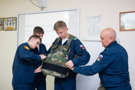 Чтобы понять, какие физические нагрузки предстоит испытать во время прохождения курса молодого бойца, ребятам предложили на занятии надеть каску, бронежилет, автомат. Вес кадета в таком военном обмундировании увеличился почти на 15 килограммов. Однако этот факт наших кадет не испугал.