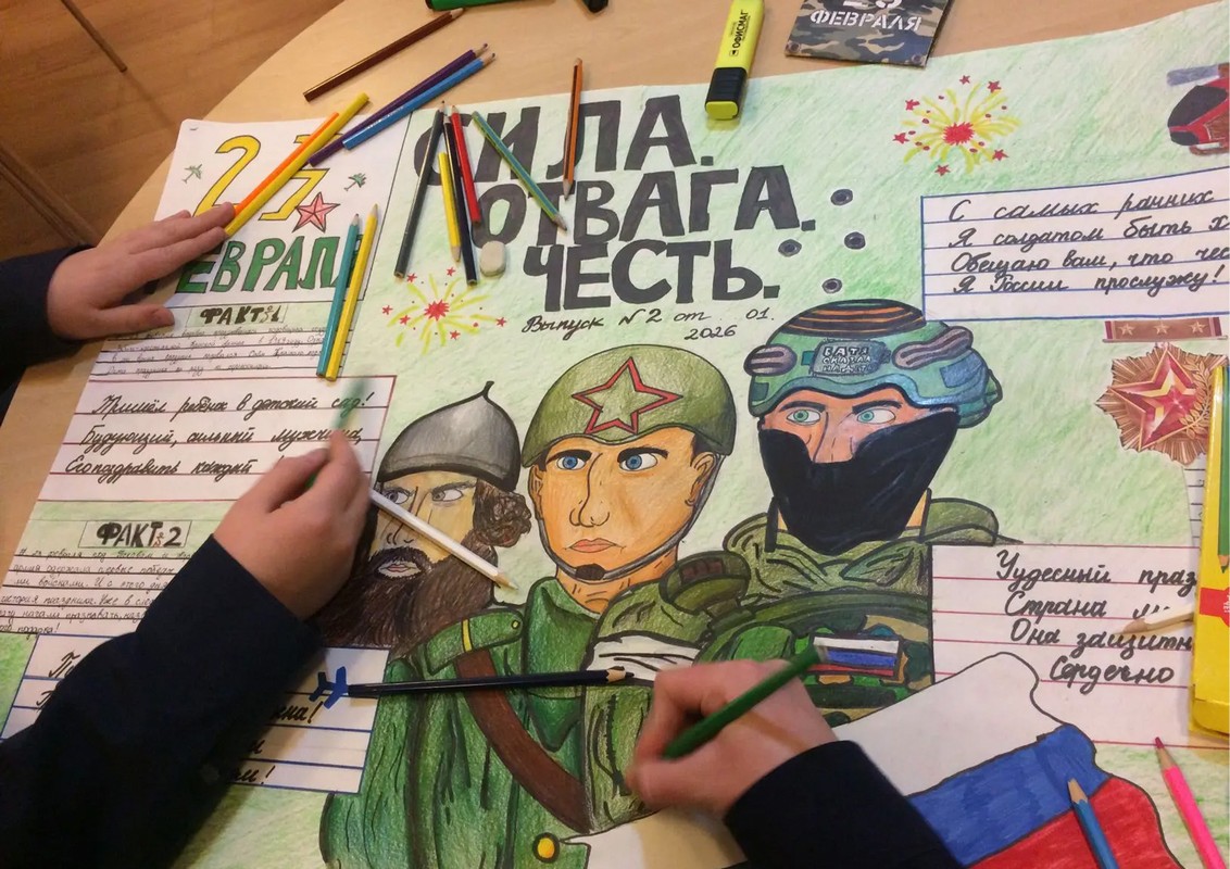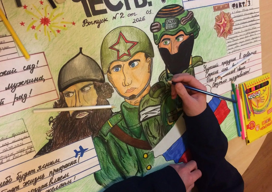 Шестиклассники Ставропольского президентского кадетского училища создали первую в 2026 году стенгазету. Они посвятили её Дню защитника Отечества. Стенгазета стала для воспитанников второго учебного курса не просто творческим заданием, а настоящим делом чести и воплощением кадетского братства. На протяжении двух недель кадеты из 6 «В», 6 «Г», 6 «Д» и 6 «Е» классов – Вадим Буц, Родион Батищев, Герман Ашихмин, Кирилл Антошин и Игнатий Котенко – вкладывали в проект свои силы и вдохновение, оставаясь работать в свободное от занятий время.