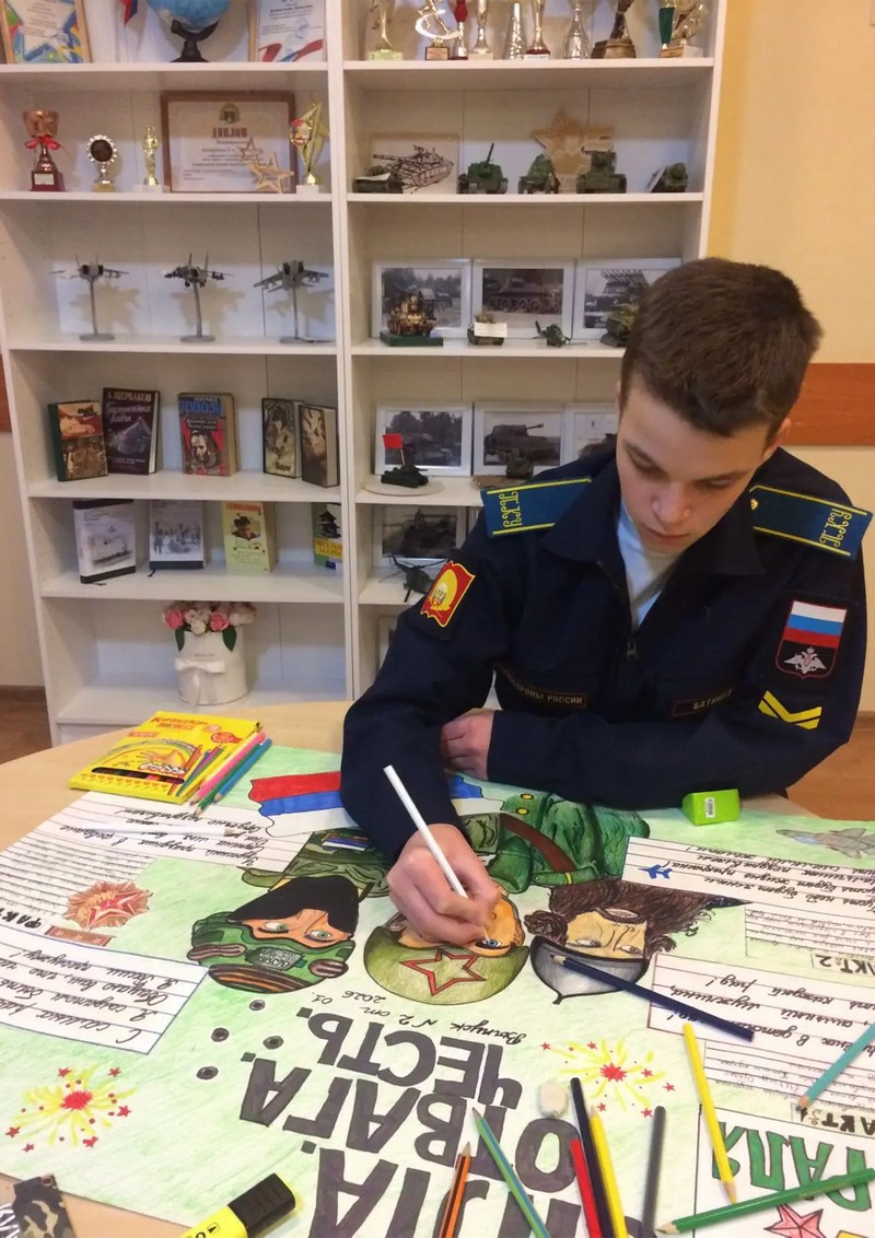 Газета получилась не только яркой, но и глубоко содержательной. Она насыщена историческими справками, праздничными стихотворениями и авторскими портретами, которые создали сами воспитанники. Завершающим и самым торжественным аккордом в создании проекта стало общее дело: готовую стенгазету на почётное место повесили кадеты вместе с начальником второго учебного курса Петром Николаевичем Кучеровым.