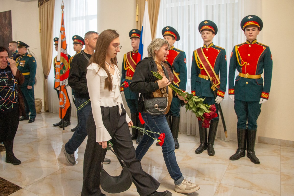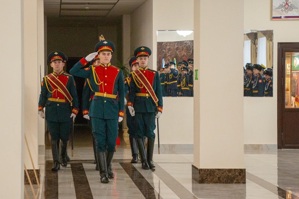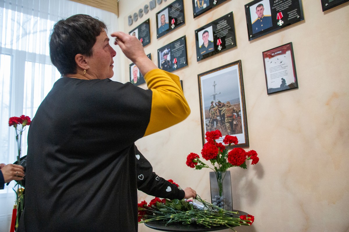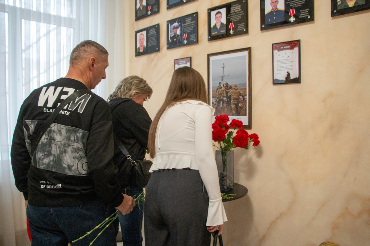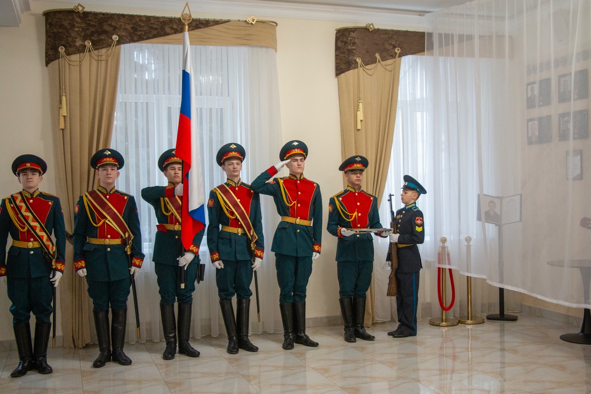 После минуты молчания, которой почтили память погибших героев, право открыть Стену Памяти было предоставлено кадету 6 учебного курса СПКУ Хасану Калицеву и матери погибшего в зоне проведения СВО выпускника училища.