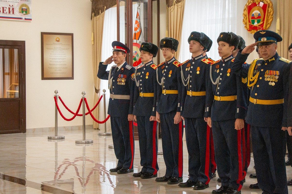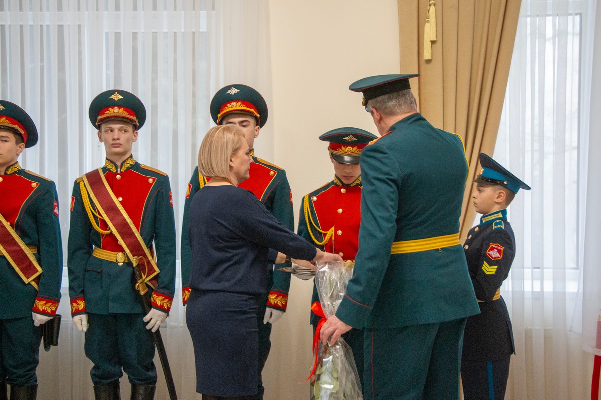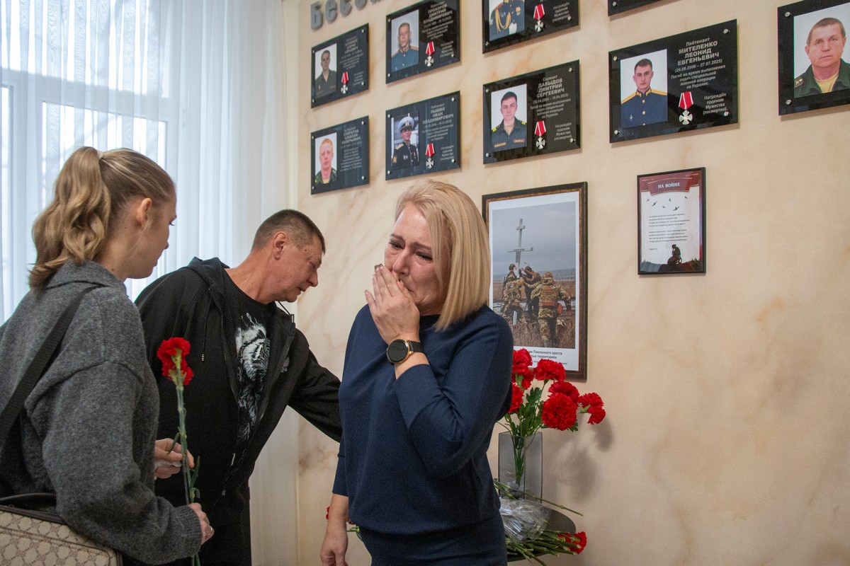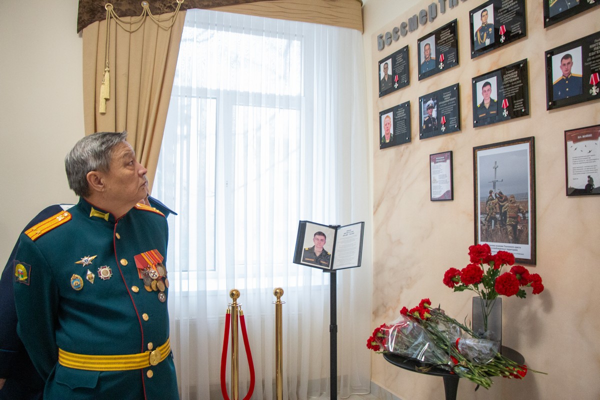 После минуты молчания, которой почтили память погибших героев, право открыть Стену Памяти было предоставлено кадету 6 учебного курса СПКУ Хасану Калицеву и матери погибшего в зоне проведения СВО выпускника училища.