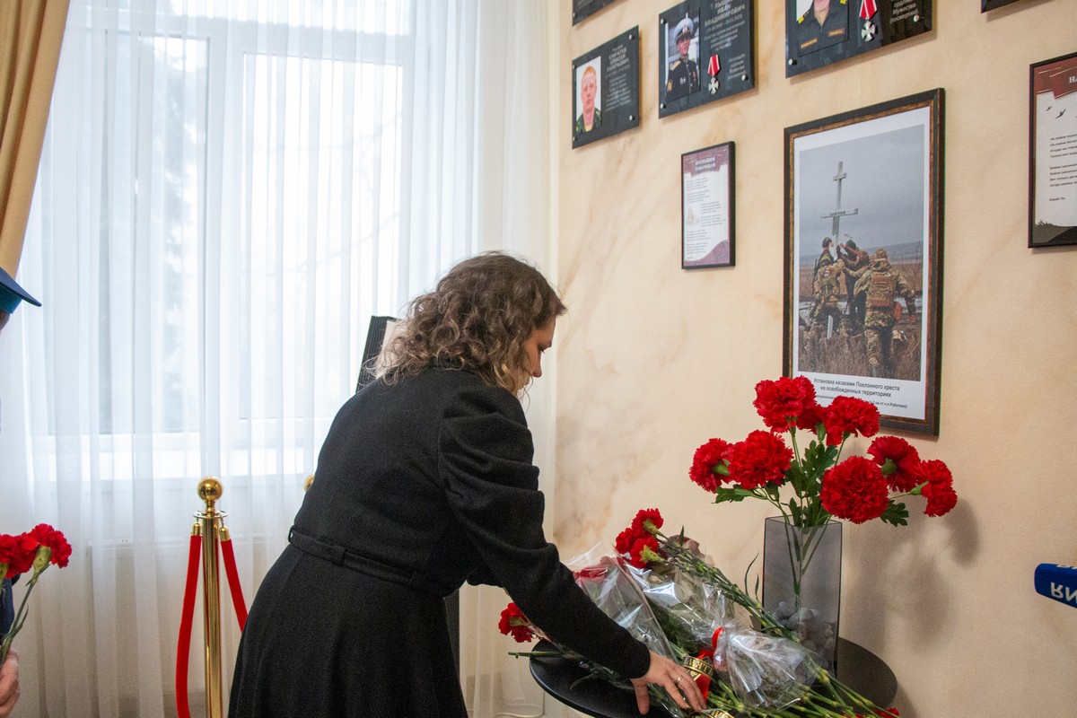 – Трудно говорить какие-то слова в такие моменты. Но Герои в России всегда были, есть и будут. Сегодня мы здесь собрались для того, чтобы увековечить память наших сотрудников и наших выпускников, которые отдали свою жизнь, разменяли её на жизни других сотни тысяч жителей на той территории, которая сейчас ещё не в полной мере освобождена. Мы сегодня открываем мемориал, на котором навсегда в нашей памяти будет находиться Бессмертный полк СПКУ. Кроме портретов наших Героев в мемориал у нас входит карта боевых действий, на которой показано, где наши сотрудники и выпускники участвуют в боях, а где погибли… Карта постоянно будет корректироваться с учётом освобождения наших территорий. В центре мемориала фотография. Этот снимок нам привёз атаман российского казачьего войска. На нём запечатлено, как они устанавливают крест в населённом пункте Работино. Крест устанавливали под ударами дронов. Именно там в этот момент погиб один из наших сотрудников.