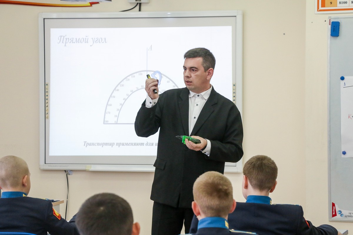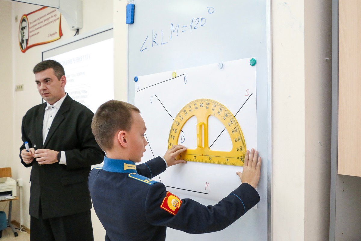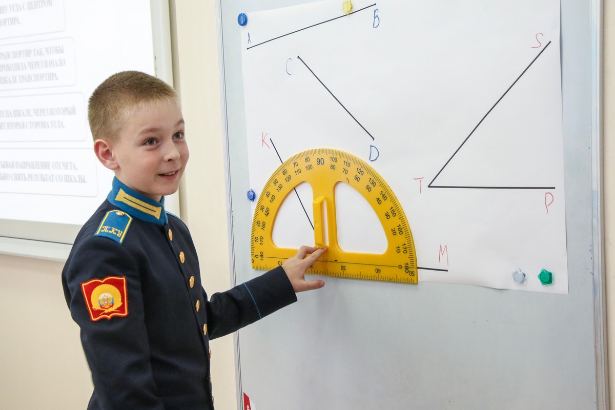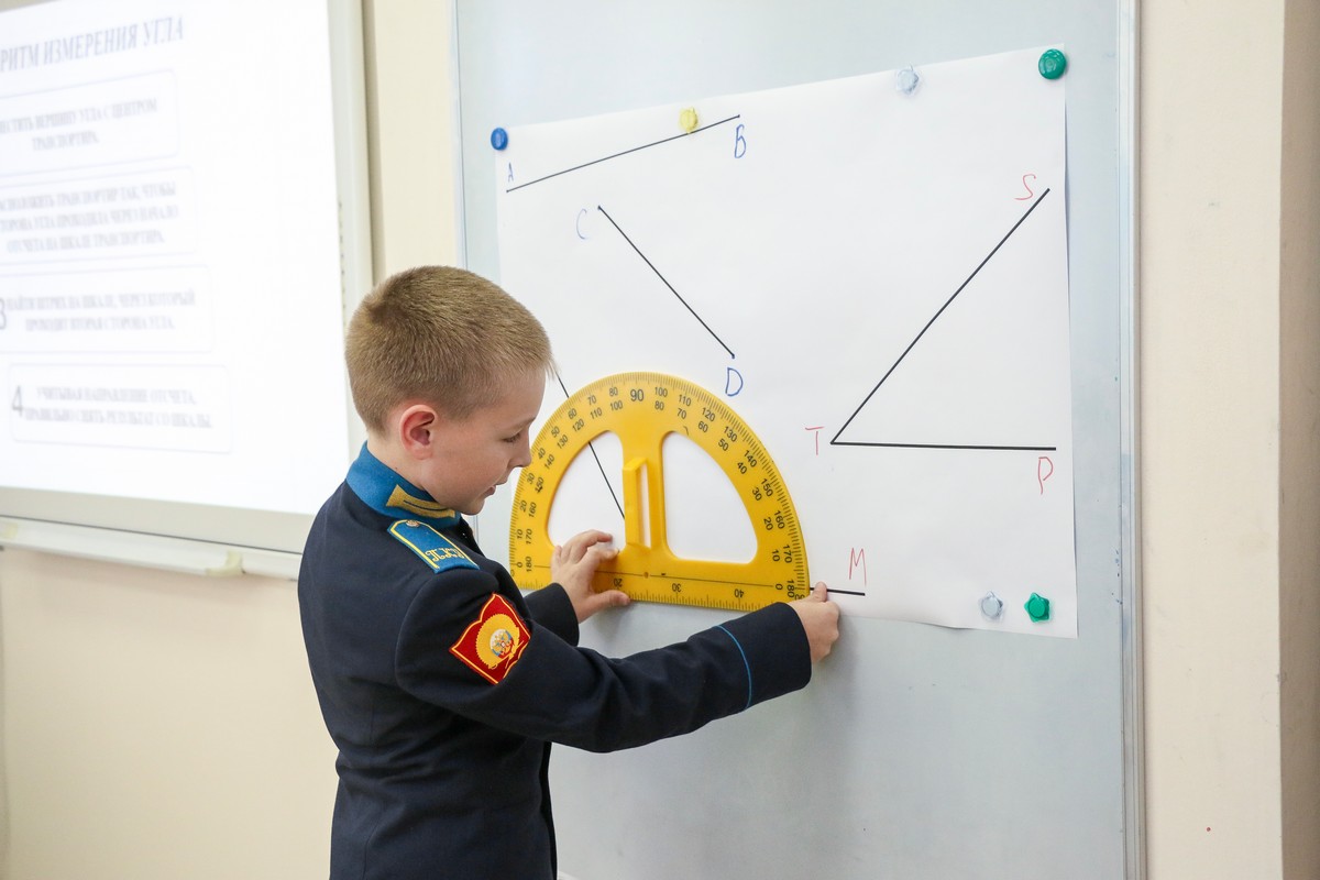 Пятиклассники узнали: как сравнивать углы, что измеряются они в градусах, познакомились и научились пользоваться новым измерительным прибором – транспортиром. Преподаватель Иванов, используя передовые педагогические технологии и методологические подходы, способствовал углубленному пониманию учащимися теоретических аспектов и практического применения изучаемой темы. Даже физразминка во время занятия была посвящена теме углов. Кадеты пытались руками изобразить тупой, прямой и острый углы, совершая повороты на 90 и 180 градусов.