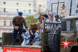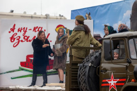 После на площади началась театрализованная часть парада: появились передвижные диорамы с актёрами. Декорированные автомашины демонстрировали главные исторические вехи Великой Отечественной войны 1941-1945 годов и времени восстановления страны. В этот раз была добавлена ещё одна «страница» истории – основные события специальной военной операции.