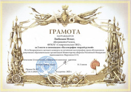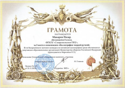 В номинации «Конкурс каллиграфии твёрдой ручкой» кадет 6 «Б» класса Смоленский Роман и кадет 9 «Д» Игнат Любимов заняли II место, кадет 8 «Б» класса Макаров Назар – III место (руководитель – преподаватель китайского языка СПКУ Оксана Леонидовна Маринина).