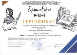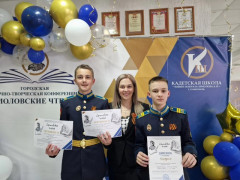Кадеты 3 курса Ставропольского президентского кадетского училища Ярослав Мальцев, Глеб Петров и Леонид Рогачев вместе со своими наставниками: преподавателем ОД (математика, информатика и ИКТ) Натальей Александровной Ивановой и преподавателями ОД (русский язык и литература) Мариной Александровной Бовиной и Еленой Николаевной Широкой приняли участие в городской научно-творческой конференции «Ермоловские чтения», проводимой на базе кадетской школы имени генерала Ермолова А.П. города Ставрополя.