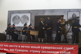После демонстрации боевой техники на площади началась театрализованная часть парада: появились передвижные диорамы с актёрами. Декорированные автомашины демонстрировали главные исторические вехи Великой Отечественной войны 1941-1945 годов и времени восстановления страны. В этот раз была добавлена ещё одна «страница» истории Великой Отечественной войны – открытие суворовских военных училищ в 1943 году. В этой инсценировке участвовали кадеты младших классов АДЕККК и СПКУ.