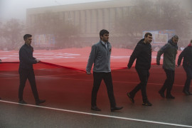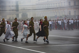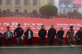 Затем над главной площадью краевой столицы растянулась самая большая в мире копия Знамени Победы. Общий размер полотна – около 1,5 тысячи квадратных метров.