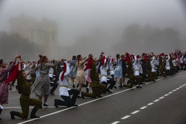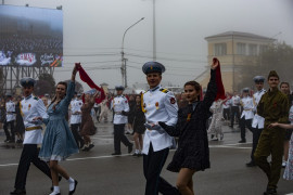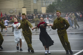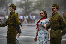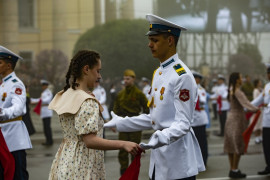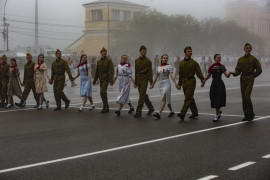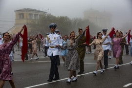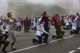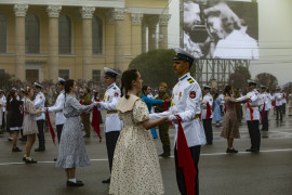Завершился парад «Вальсом Победы». Под военные песни в вальсе закружились около тысячи парней и девушек, в том числе и кадеты 11-х классов Ставропольского президентского кадетского училища.