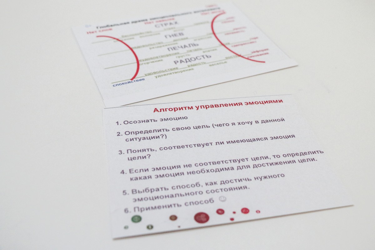 - познакомились с алгоритмом управления эмоциональным состоянием: был представлен пошаговый алгоритм, включающий в себя осознание эмоции, ее принятие, анализ причин возникновения и выбор эффективной стратегии управления. Участники учились правильно идентифицировать свои чувства, понимать их триггеры и применять соответствующие техники для их регулирования.