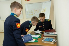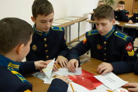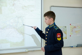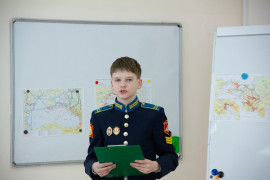 Кадеты 7 класса в рамках курса «От простого к сложному» совместно с преподавателями математики Юлией Сергеевной Радченко и Мариной Викторовной Горячовой на открытом мероприятии проанализировали известные математические стратегии и показали на примере различных сражений Великой Отечественной войны, как связаны математические модели стратегий и реальные боевые операции на примере Керченско-Эльтигенской десантной операции, наступательной операции северной группы на Нальчинско-Ставропольском направлении, Новороссийско-Таманской операции.