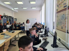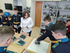 Во время открытого урока Юлия Викторовна продемонстрировала эффективность образовательной робототехники в развитие функциональной грамотности и упрочении мотивации к изучению информатики. На уроке кадеты решали задачу упрощения программы для робота, путём использования алгоритмической конструкции «цикл».