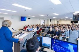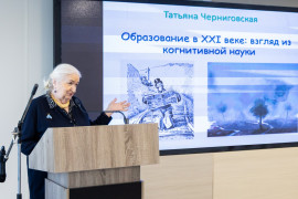 С докладом «Образование в XXI веке: взгляд из когнитивной науки» выступила Татьяна Черниговская – директор Института когнитивных исследований СПбГУ, доктор биологических наук, доктор филологических наук, академик Российской академии образования. Также перед собравшимися выступили Валерия Карпинская, доктор психологических наук, профессор Института когнитивных исследований СПбГУ, и Татьяна Мамина, кандидат психологических наук, старший научный сотрудник того же института.