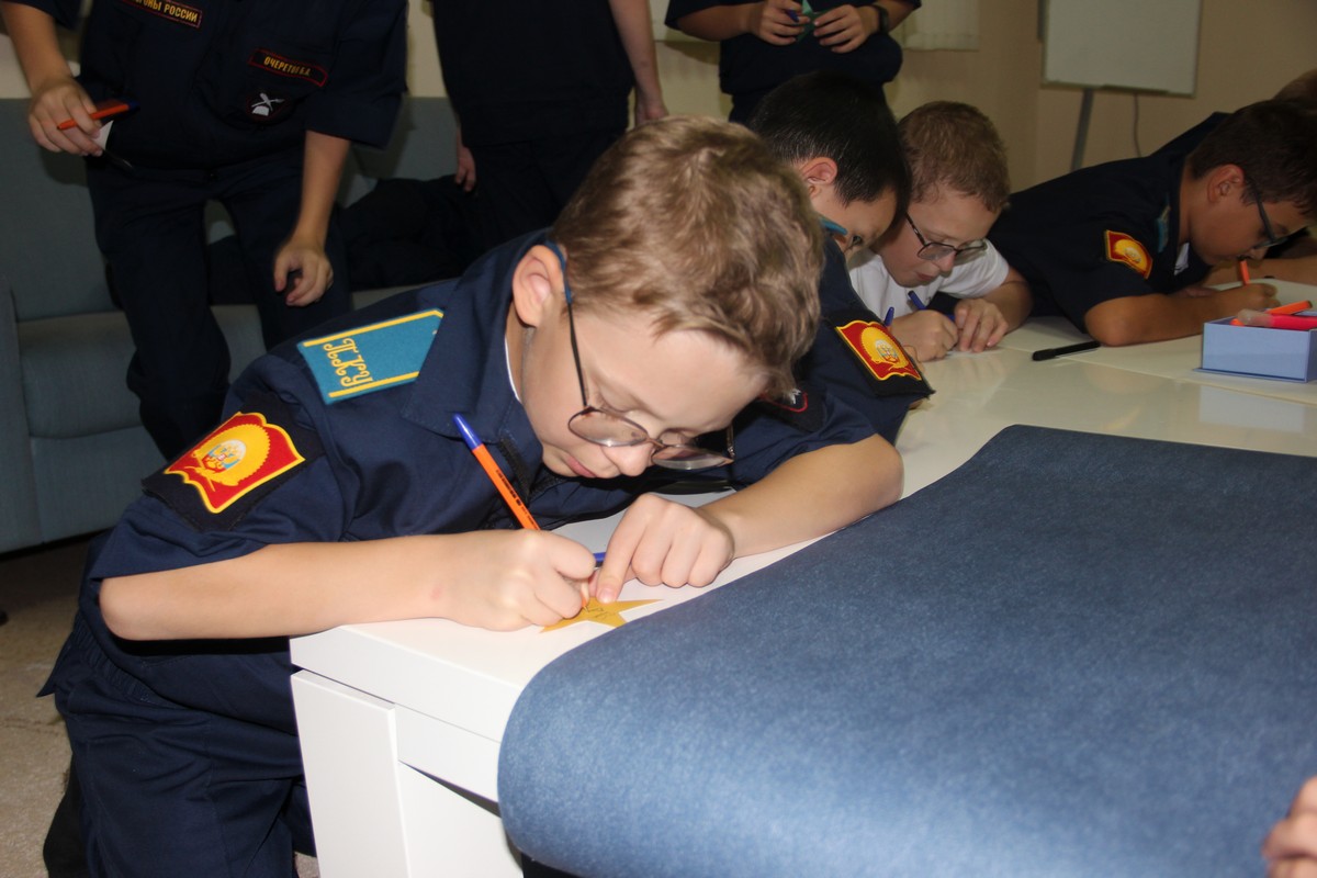 После знакомства друг с другом на втором занятии кадеты успешно справились с нелёгкой задачей, направленной на сплочение классных коллективов и понимание границ друг друга. Занятие включало в себя индивидуальную и групповую формы работы. Каждый кадет после визуализации под музыку смог материализовать свой представленный образ при помощи предложенного шаблона звезды. На которой каждый смог описать какая у него звезда? Большая или маленькая? Холодная как лед или горячая, как пламя костра? Какого она цвета? Какой формы? Загадать желание или поставить себе цель. После чего всего звезды оказались на одном звёздном небосклоне класса.