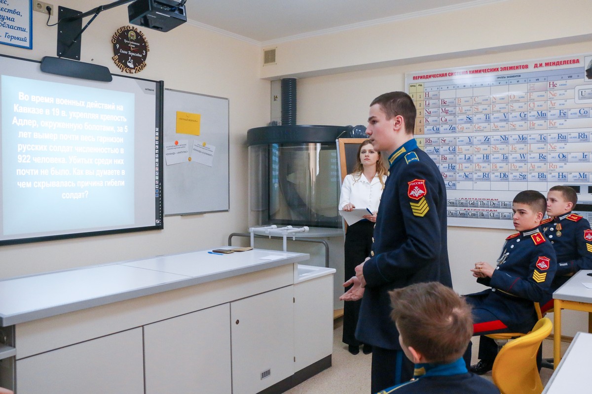 В начале игры кадеты рассуждали о значении образования для человека, говорили о смысле цитаты «Науки юношей питают» великого русского ученого Михаила Васильевича Ломоносова.