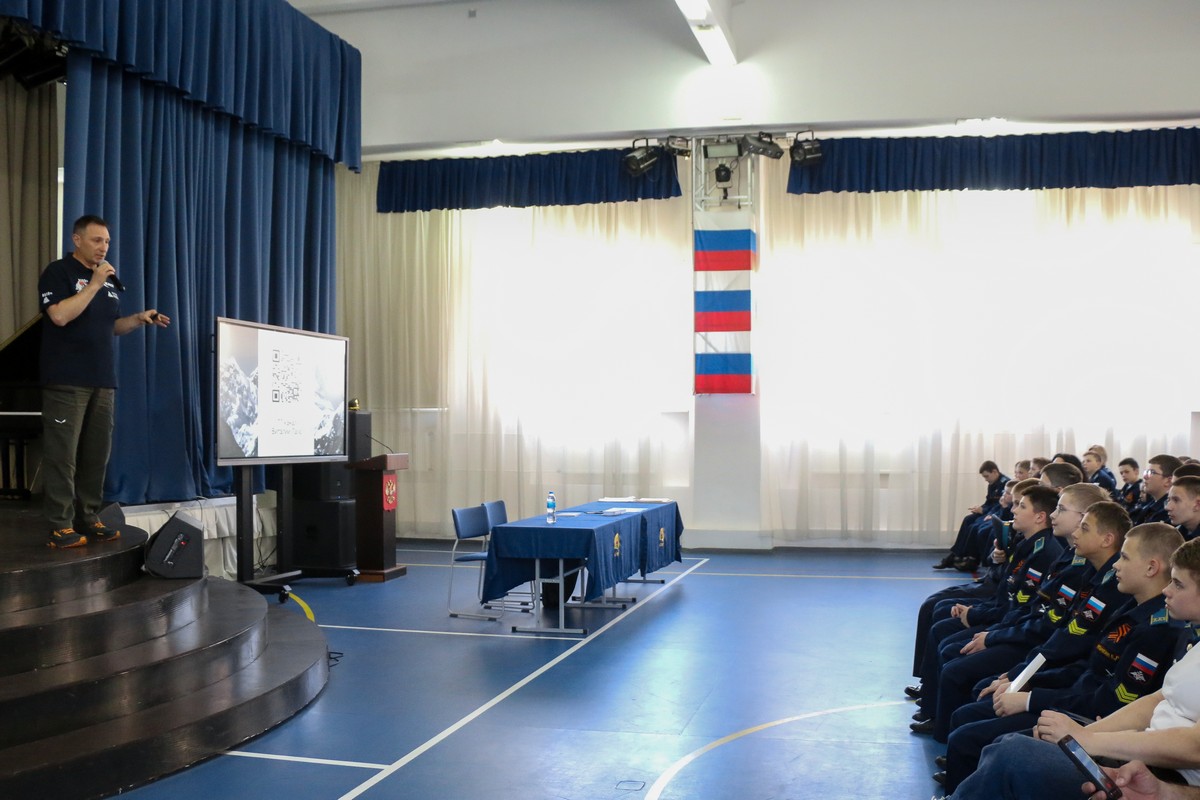 Кадеты узнали, что «Снежный барс» – это почётный титул, который присваивается альпинистам, покорившим пять высочайших вершин СССР. Виталий рассказал о своей экспедиции 2021 года на К2 (Чогори) – вторую по высоте гору мира (8611 метров), а также о восхождении 2023 года на Эверест (8848 метров). Кстати, у Эвереста есть и другие названия – Сагарматха («Мать всего») и Джомолунгма.