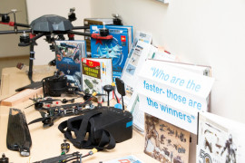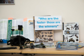 На внеурочном мероприятии также была представлена выставка трофейных деталей от дронов из зоны СВО, кадет описал её на английском языке. Название выставки «Кто быстрый, тот и победитель», так как дроны – это современное быстрое оружие.