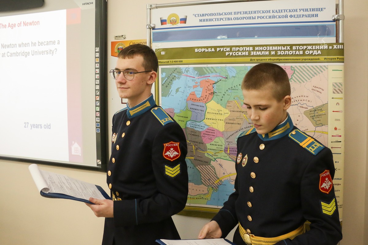 В Ставропольском президентском кадетском училище продолжается фестиваль «Научный февраль», и с каждым днём его события становятся всё ярче и необычнее. На этот раз в центре внимания оказался 7И (инженерный) класс, где прошла интеллектуальная игра-викторина на английском языке «From Newton to Now» («От Ньютона до наших дней»). Преподаватели иностранного языка Анна Григорьевна Бурова и Елена Ивановна Орлова организовали мероприятие в формате популярного шоу Jeopardy (в России известного как «Своя игра»).