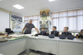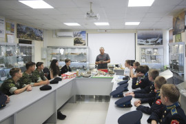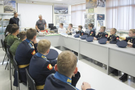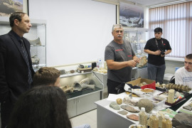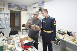 Михаил Шерстюков также прочитал кадетам увлекательную лекцию о прошлом нашей планеты, познакомил с реконструкцией геологической истории Земли. Кадеты увидели отпечатки следов динозавра Игуанодона, которые были найдены в окрестностях города Кисловодска, а также окаменевших аммонитов, белемнитов и других древних обитателей Северного Кавказа.