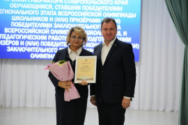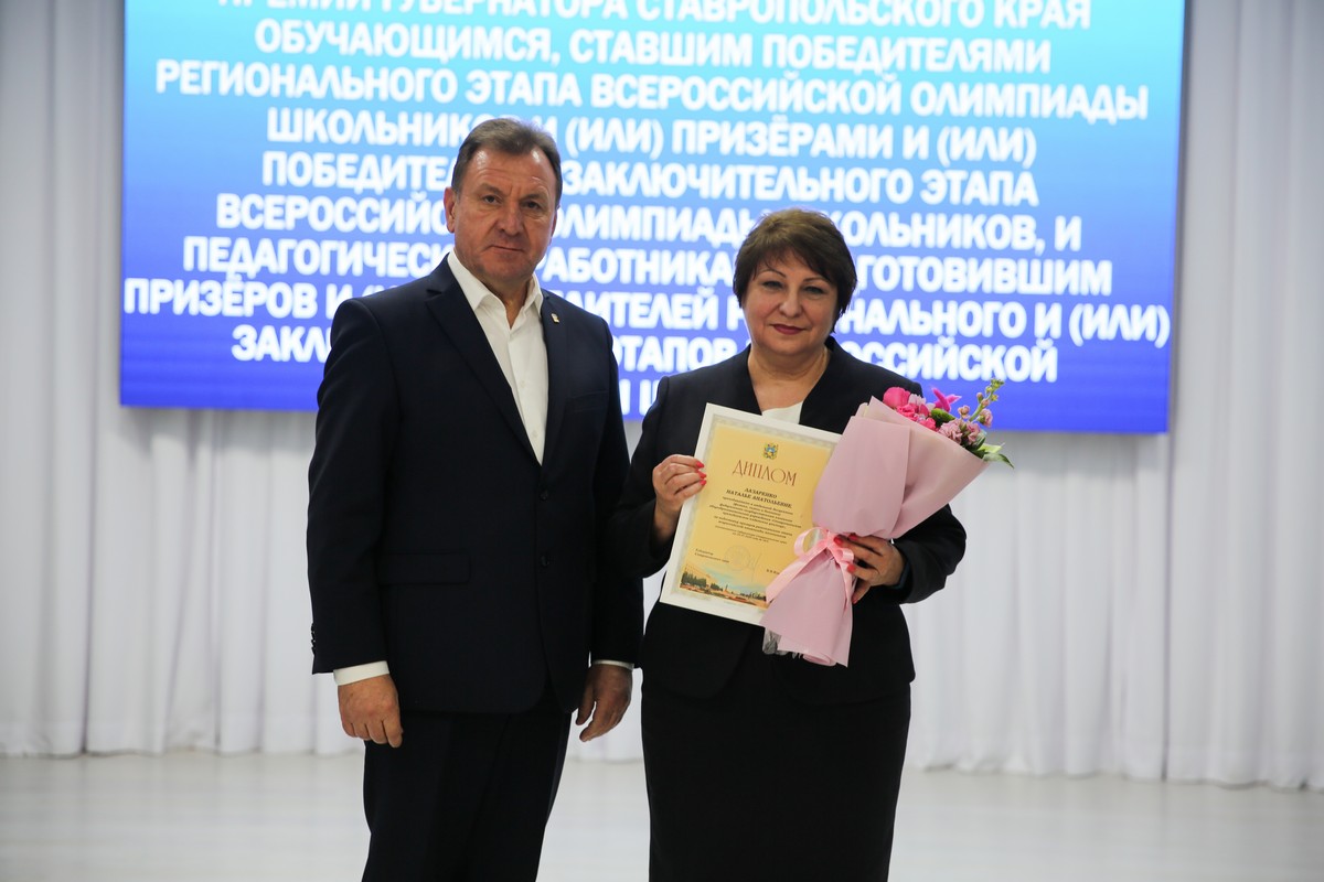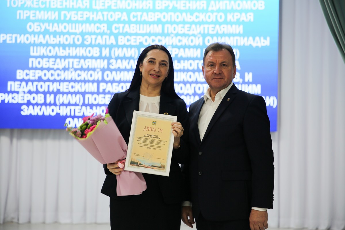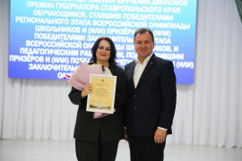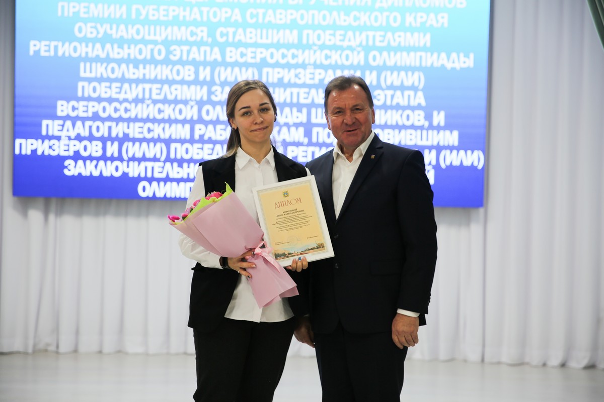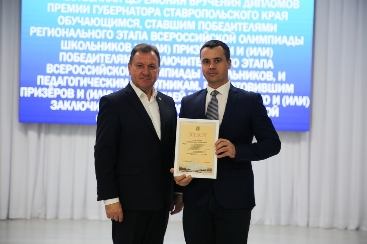 Глава города Ставрополя Иван Иванович Ульянченко от всей души поздравил обучающихся с прекрасными результатами, выразил огромную благодарность их наставникам-педагогам и вручил дипломы премии губернатора Ставропольского края.