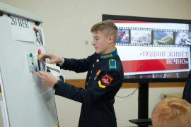 Для каждого из нас важно знать историю своей Родины. История – это память народа о том, кто мы, где наши корни, каков наш путь? Самое важное – знать историческое прошлое нашей страны – любить её. Мы любим нашу Родину – Россию и эта любовь испокон веков проявляется в готовности граждан стать на её защиту. Об этом рассуждали кадеты с педагогом во время классного часа. Имена героев, не щадивших своей жизни ради Отечества, вспоминали кадеты. Говорили о великом полководце Александре Васильевиче Суворове, о героях войны 1812 года, о Великой Отечественной войне 1941-1945 годов, о героях наших дней. Не всегда эти люди проявляли героизм во время боевых действий. Место подвигу есть и в повседневной жизни, спасти человека во время пожара, помочь утопающему, рискуя жизнью бороться с эпидемиями и болезнями – это тоже подвиг.