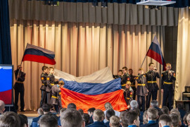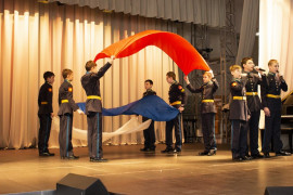 Номер «Флаг моего государства». 9В класс, солист Мирошников Иван. Руководители: Ленкова Т.И. Гусейнов В.Ф., воспитатели.