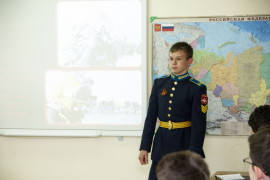 Провела классный час Ирина Валерьевна Дьякова. Ребята вместе с педагогом искали ответы на главные вопросы: «Кто такие настоящие мужчины? Каковы главные качества настоящего мужчины-офицера?». Кадеты во время внеурочного мероприятия совершили краткий экскурс в историю легендарных полководцев и патриотов Отчизны, истинных защитников своего Отечества.