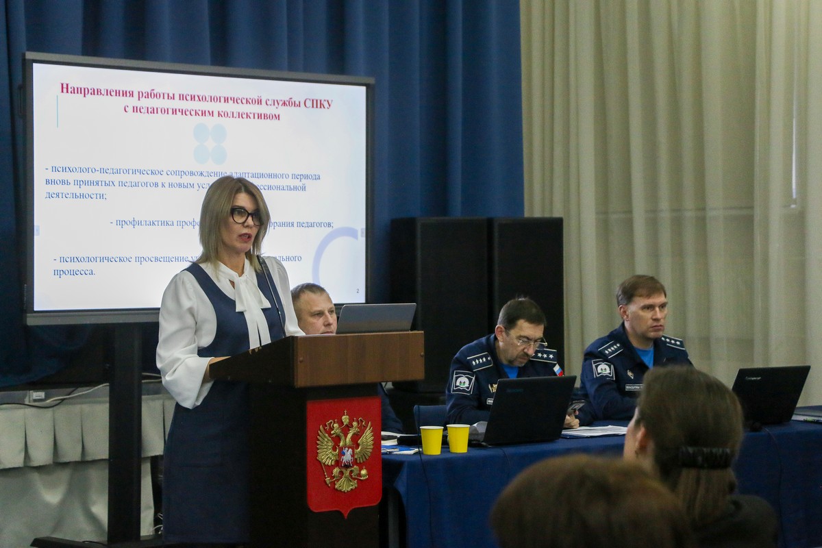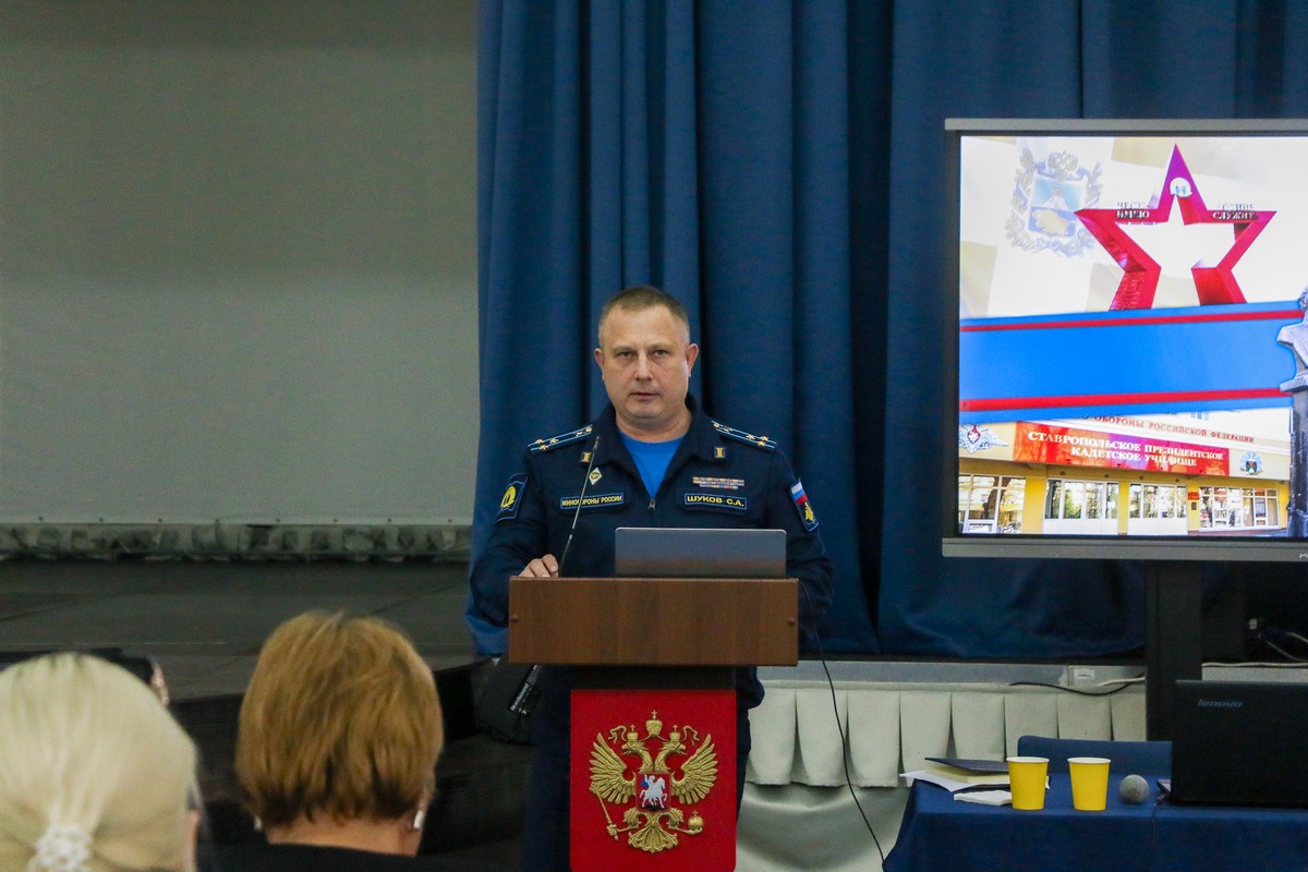 19 ноября в Ставропольском президентском кадетском училище прошло заседание педагогического совета по теме «Социально-психологический портрет современного ученика и профессиональный портрет современного педагога (социально-психолого-педагогическое сопровождение основных участников образовательной деятельности: обучающихся, их родителей и педагогов)». Открыл работу педсовета ВрИО начальника СПКУ Сергей Анатольевич Шуков.