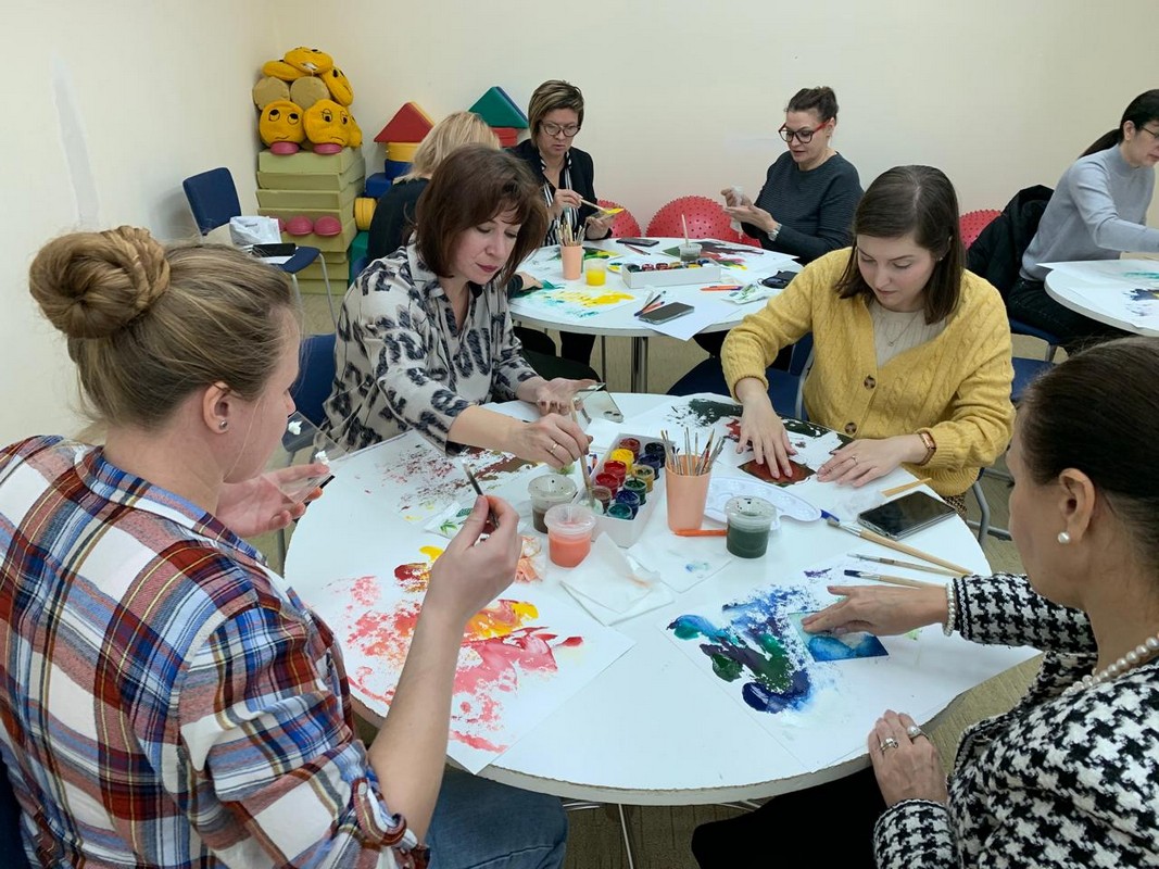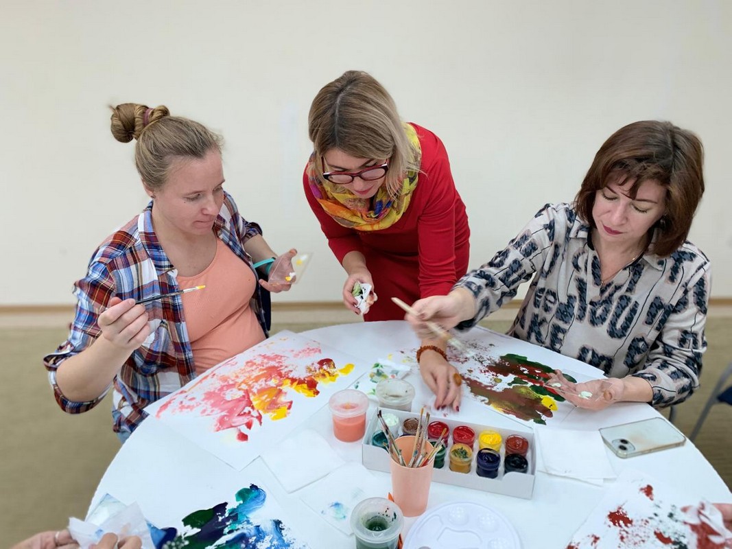 В начале арт-тренинга Илона Евгеньевна провела увлекательную вводную беседу о психологии цвета и его влиянии на наше эмоциональное состояние. Участники узнали, как разные оттенки могут пробуждать определенные чувства и воспоминания, и как это можно использовать для гармонизации своего внутреннего мира.
