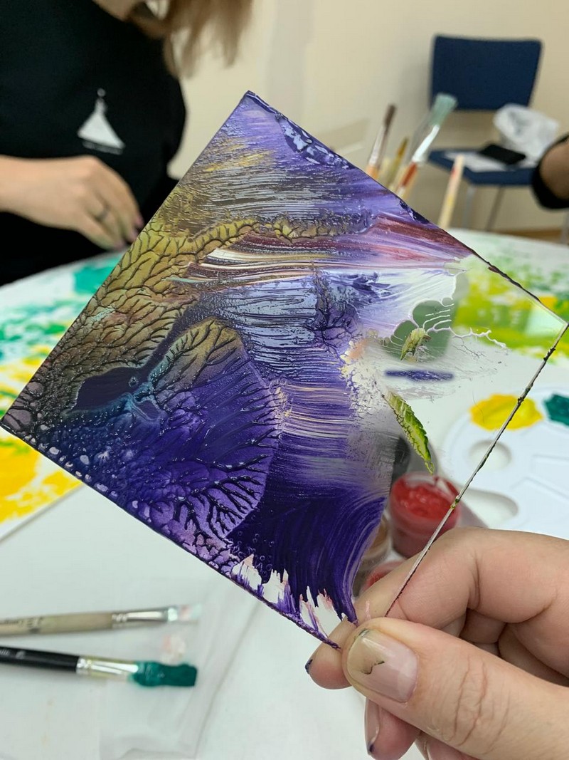 Затем наступила самая волнующая часть – практическая. Каждому участнику было предложено с помощью нанесения на стекло красок погрузиться в процесс создания собственного шедевра на листе бумаги. Под руководством Илоны Евгеньевны педагоги экспериментировали, смешивая краски и позволяли интуиции вести по бумаге стекло и кисть, создавая уникальные образы.