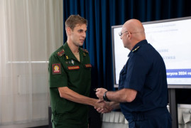 Затем начальник 1 учебного курса Пётр Николаевич Кучеров рассказал об итогах поступления выпускников СПКУ 2024 года в вузы Министерства обороны Российской Федерации.