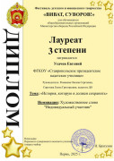 Участник кадетского театра «Искусство побеждать» Ставропольского президентского кадетского училища стал призером конкурса детского и юношеского творчества «Виват, Суворов!», который проводился в соответствии с Планом основных мероприятий Главного управления кадров Министерства обороны Российской Федерации. Конкурс проходил заочно. Кадет 5А класса Евгений Усачёв представил выступление по теме «История, которую я должен сохранить» в номинации «Художественное слово. Индивидуальный участник».