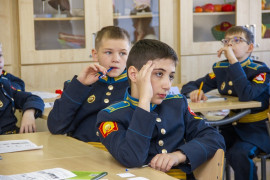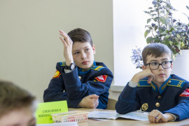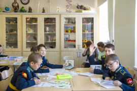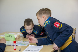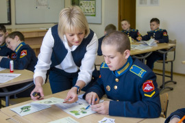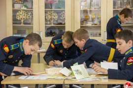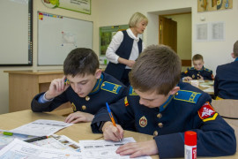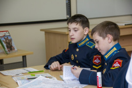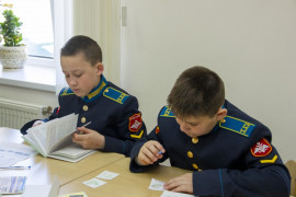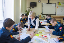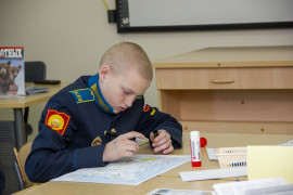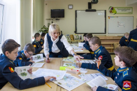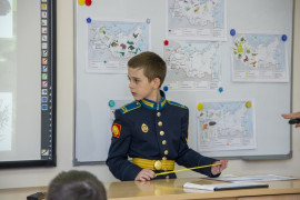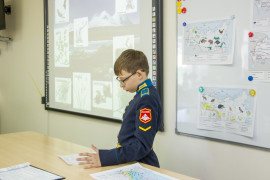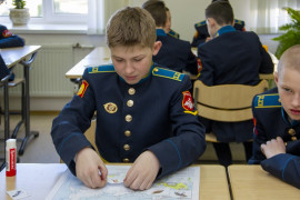 На уроке кадеты разбирались в расположении природных зон на карте России и выясняли особенности её флоры и фауны. Работая в группах, обозначили расположение зоны на контурной карте, определили видовой состав растений и животных, воспользовавшись атласами определителями и дидактическими карточками птиц и зверей.