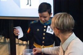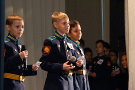 Для примера конкурсантам было предложено посмотреть один видеоролик из этой серии со звуком. Далее кадеты озвучивали тексты, а на экране началось мульти-путешествие по регионам России, которые знамениты своими традициями и ремёслами: Архангельск с его деревянными ажурными птицами счастья, Сергиев Посад с русской матрёшкой, Нижегородская область с золотой хохломой, Вятский край с дымковской игрушкой и многие другие.