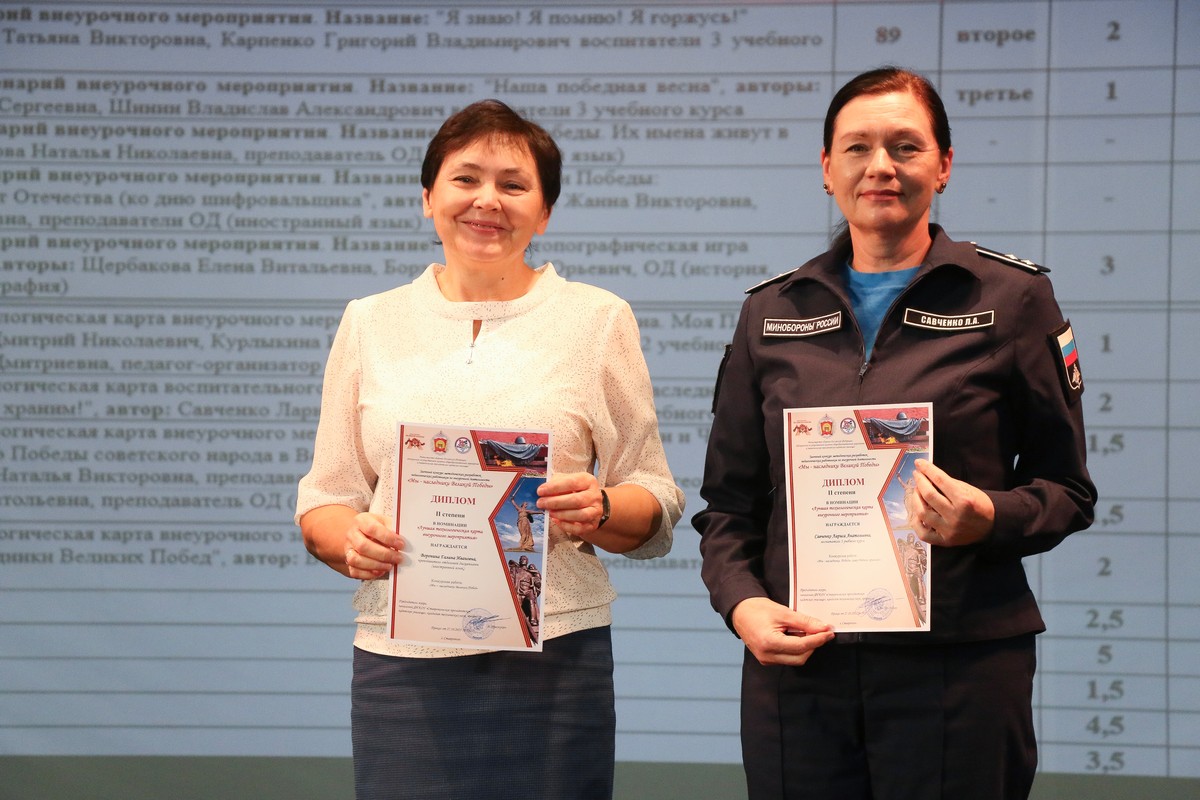 Победителем Фестиваля-конкурса в номинации «Разговоры о важном» стала Екатерина Ростиславовна Габдиянова, преподавателя отдельной дисциплины (иностранный язык), I место за метапредметное внеурочное занятие «О чём шепчут деревья?». Дипломом II степени награждены педагоги команды «Три плюс два» Игорь Викторович Мирошниченко, педагог-организатор, Ирина Васильевна Голованова, преподаватель (руководитель дисциплины) отдельной дисциплины (математика, информатика и ИКТ) и Сергей Андреевич Иванов, преподаватель отдельной дисциплины (математика, информатика и ИКТ), организовавшие разговор о важном в ходе «Прямой линии», в которой кадеты первого курса могли здесь и сейчас задать вопрос и получить ответ от руководства и педагогов училища.