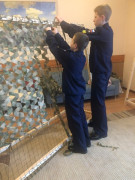 Маскировочные сети жизненно необходимы в зоне СВО для скрытия полевых позиций, техники, разведчиков. Каждое маскировочное покрытие – это результат ручного труда. Для его производства необходима дель – сетка из капроновых нитей. Её кадеты натягивают на ткацкий станок, после чего вплетают в неё маскировочную ткань.