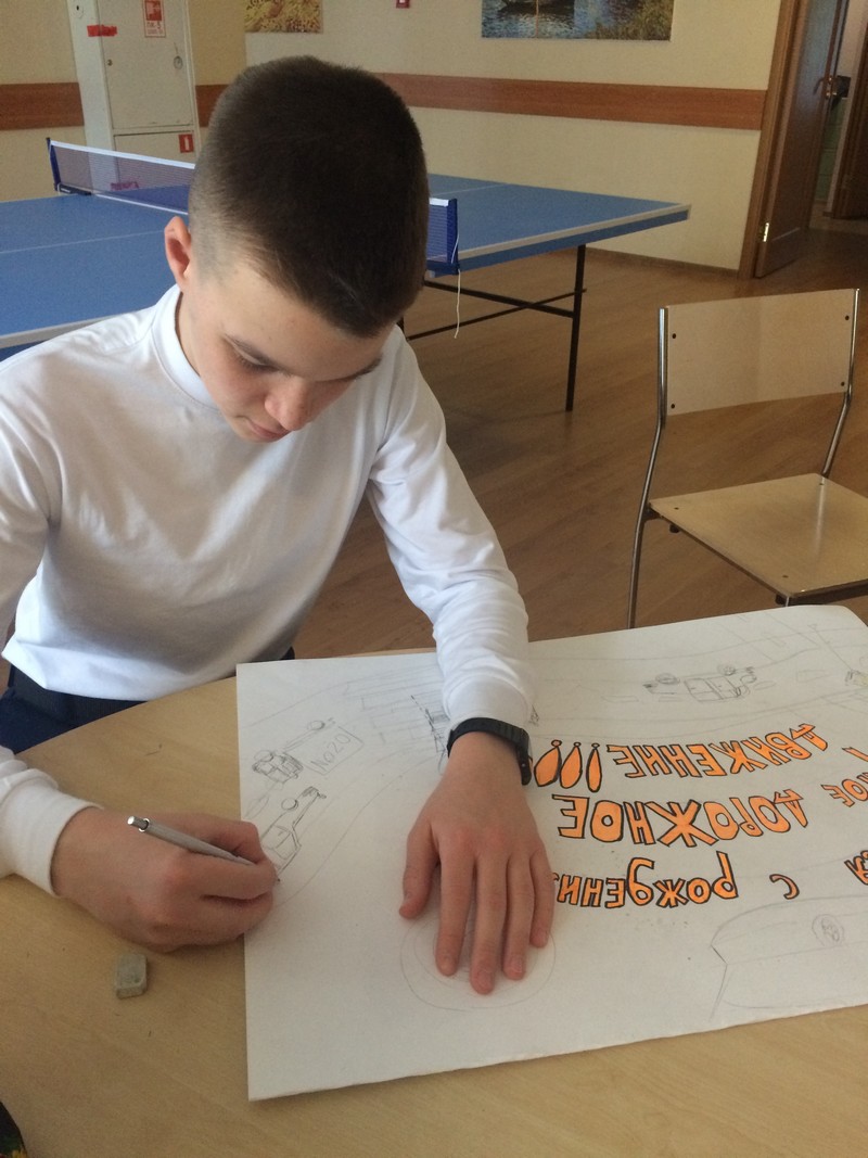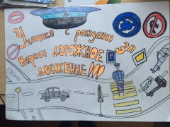 Вторая работа – плакат с лозунгом конкурса и глубоким поучительным смыслом. Над его созданием трудились кадеты 6 «Г» класса: Даниил Тимаревский, Матвей Дешпет и Родион Батищев. Ребята постарались визуально донести главную идею: дорожная безопасность зависит от каждого.