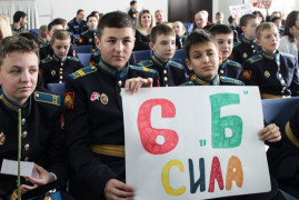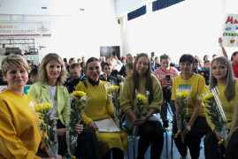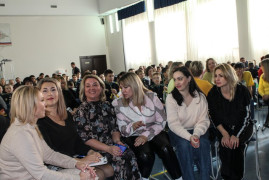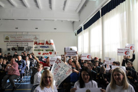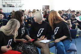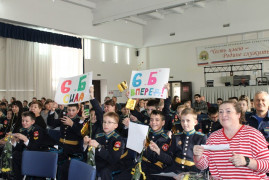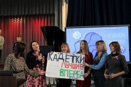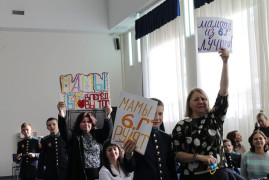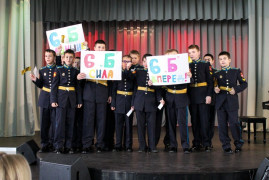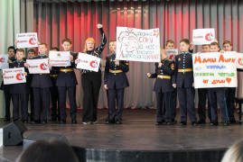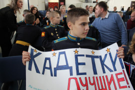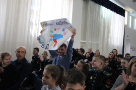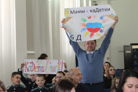 Поддержать мам пришли не только папы. Кадеты серьезно подготовились: сочинили кричалки и нарисовали плакаты. Мальчишки активно болели за своих мам: концертный зал СПКУ ещё не видел такого накала борьбы между болельщиками.