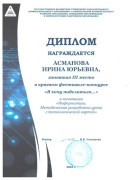 Ирина Юрьевна Асманова стала бронзовым призёром, представив на конкурс технологическую карту урока по информатике «От учения к практике в военном деле: решение вычислительных задач». Такой урок позволяет объединить основы военной подготовки и информатику при изучении темы «Решение вычислительных задач» с использованием программы MS Excel.